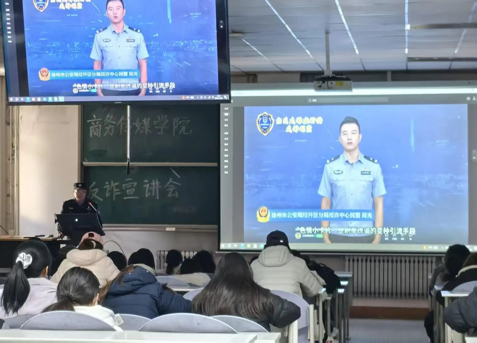胡警官结合高校案例,拆解大学生高频遭遇的诈骗场景:从“刷单返利”“注销校园贷”等常见陷阱,到“AI换脸”等新型手段,明确“凡是要求转账、发验证码、点陌生链接的,均为诈骗”的核心判断标准。同时结合我院广告、新闻专业特点,提示同学们警惕“虚假兼职推广”“版权侵权诈骗”等与专业相关的套路。
